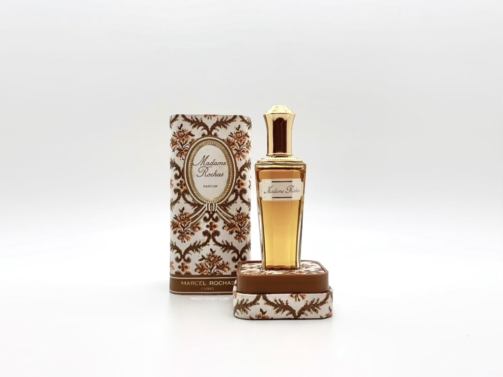 Madame Rochas是在1960年首次出現,1989年則以第二版本再度發行,調香師Guy Robert同時也是許多知名香水的創作者,如Hermès的Caleche、Gucci的Pour Homme、Gucci No 1和Amouage的Gold系列⋯⋯等。第一版本的Madame Rochas是仿照十八世紀的香水瓶來設計,第二版本則請來知名香水瓶設計師Pierre Dinand為其設計。
